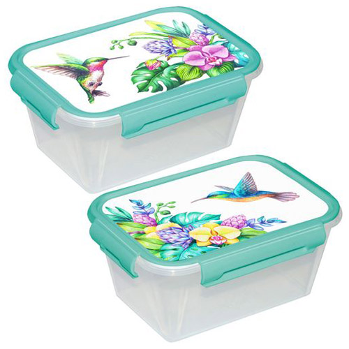 Емкость из пищевого пластика объемом 0,8л для хранения продуктов питания и готовых блюд. Крышка имеет 4 защелкивающихся замка и декорирована IML-этикеткой с современным рисунком или узором.