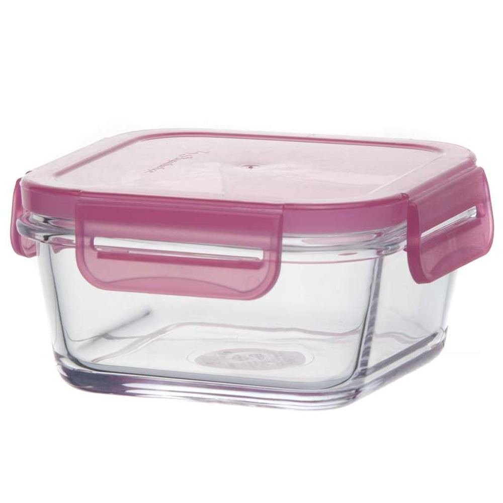 Стеклянный контейнер Pasabahce с герметичной пластиковой крышкой розового цвета.