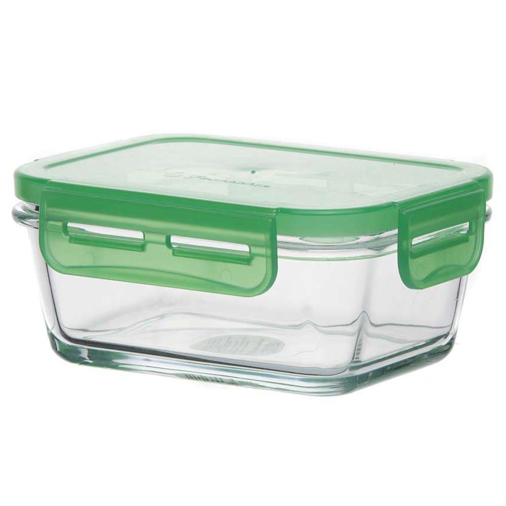 Пищевой контейнер из стекла Pasabahce с герметичной пластиковой крышкой зеленого цвета. Форма прямоугольная.