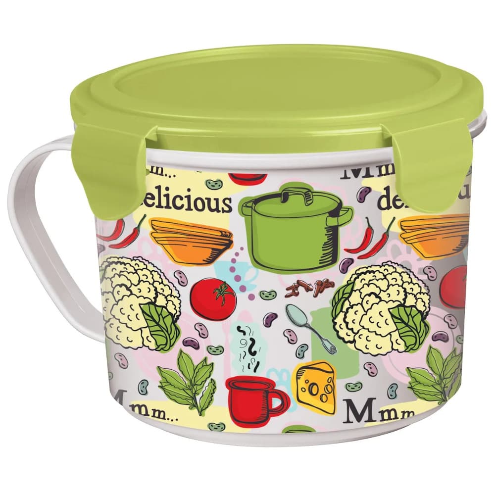 Контейнер-кружка предназначена для хранения в холодильнике, транспортировки готовых блюд и разогревания их в микроволновке (без крышки). Кружка объёмом 850 мл вместительная и подойдёт для любых блюд: горячих напитков, рагу, бульонов и другого; а также она идеальна для заваривания супов и каш быстрого приготовления.