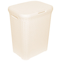 Емкость для накопления грязного белья перед стиркой. В объеме 60 л комфортна для использования в семье на несколько человек. Крышка закроет содержимое от взглядов и послужит препятствием для распространения возможных посторонних запахов. Округлая форма удобна для размещения корзины в небольших помещениях (ванных комнатах, кладовых и гардеробных). Текстура с имитацией натурального плетения "Ротанг".