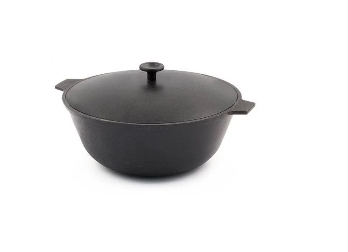 Казан литой, чугунный долго хранит тепло, позволяя тушеным блюдам дойти до идеальной готовности даже после выключения плиты.