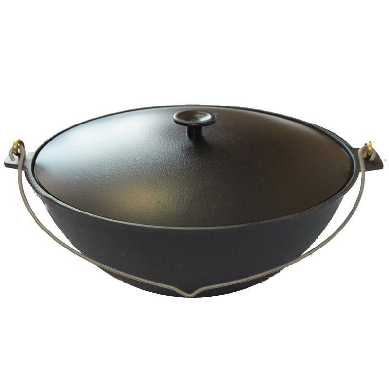 Казан имеет чугунные ручки и одну подвесную из углеродистой стали.