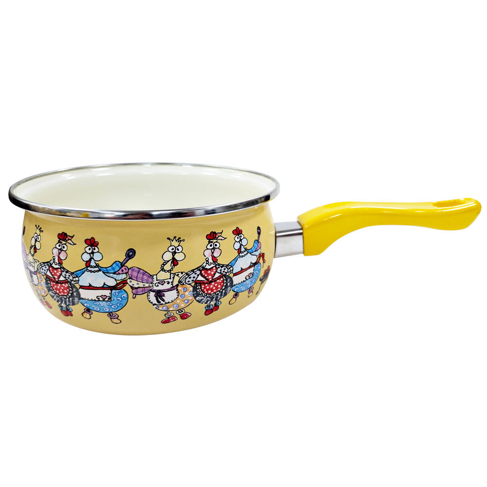 Покрытие посуды состоит из трех слоев стеклоэмали голландской фирмы Ferro. Эмалевое покрытие, являясь по сути своей стекольной массой, надежно защищает пищу от контакта с металлом, не вступает в реакцию с продуктами и не искажает их вкус. Стеклоэмаль – долговечный гипоаллергенный материал, подходит для приготовления блюд диетического и детского питания.