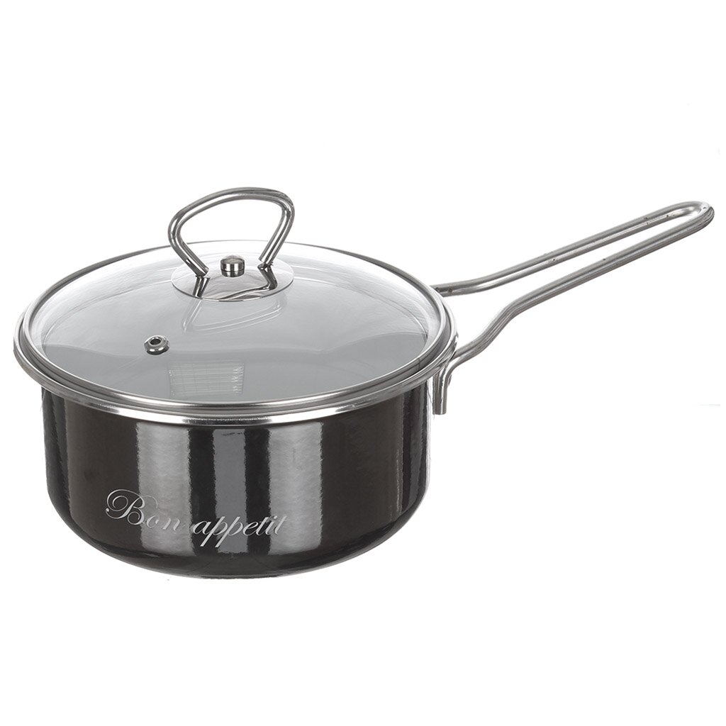 Металлическая ручка прикреплена методом клепки. В комплекте есть стеклянная крышка с пароотводом.