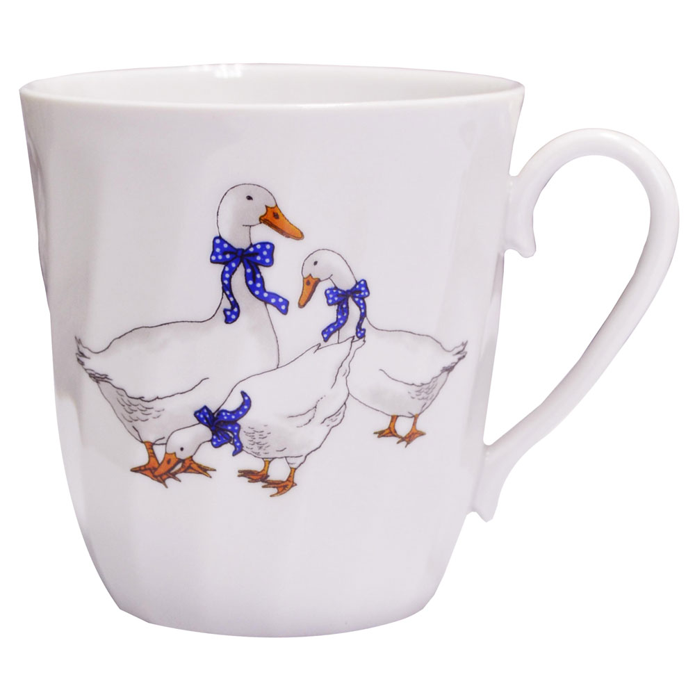 Кружка Витая Гуси (новые) изготовлена на Дулевском фарфоровом заводе из твердого фарфора с декорированием надглазурной деколью.