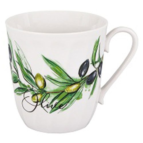 Кружка изготовлена из фарфора и декорирована рисунком Оливки. На стенках изделия витой узор.