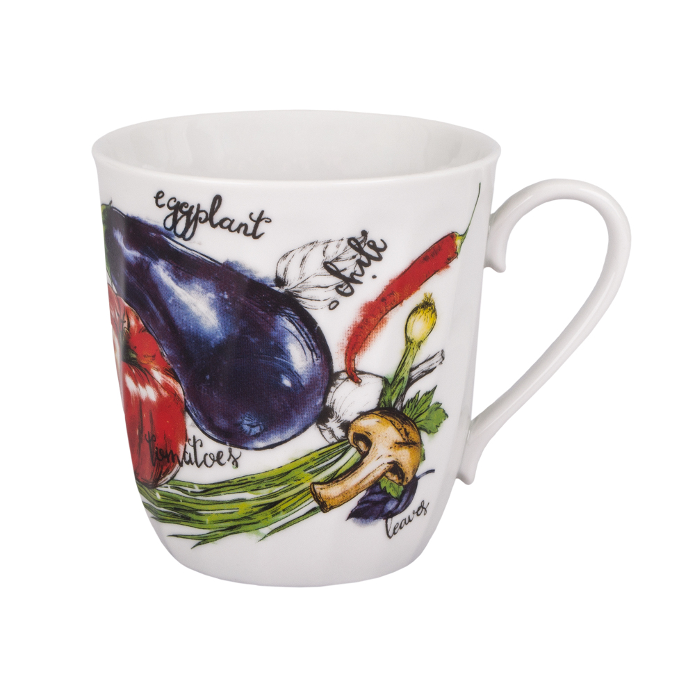 Кружка "Овощи бортовые" 350мл изготовлена из фарфора. Стенки украшены витым узором и рисунком.