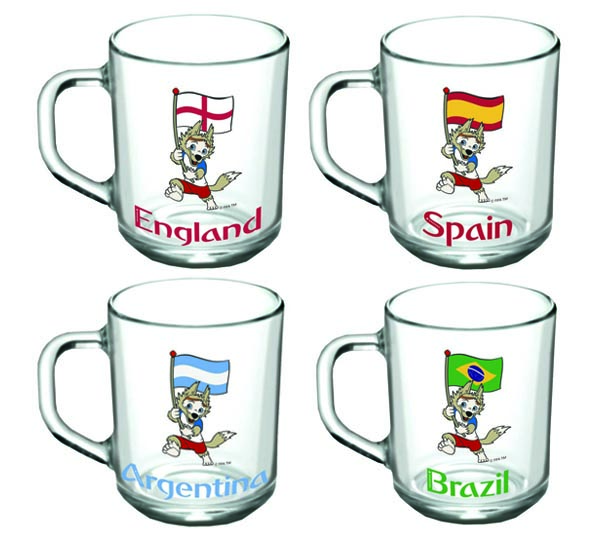 На кружке изображен талисман ЧМ - волк Забивака с флагом разных стран (Англия, Аргентина, Бразилия, Испания). Недорогой и приятный подарок всем любителям футбола.