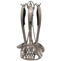 В набор входит: лопатка с прорезями; шумовка; половник; картофелемялка; поварская ложка; поварская вилка; подставка с крючками;