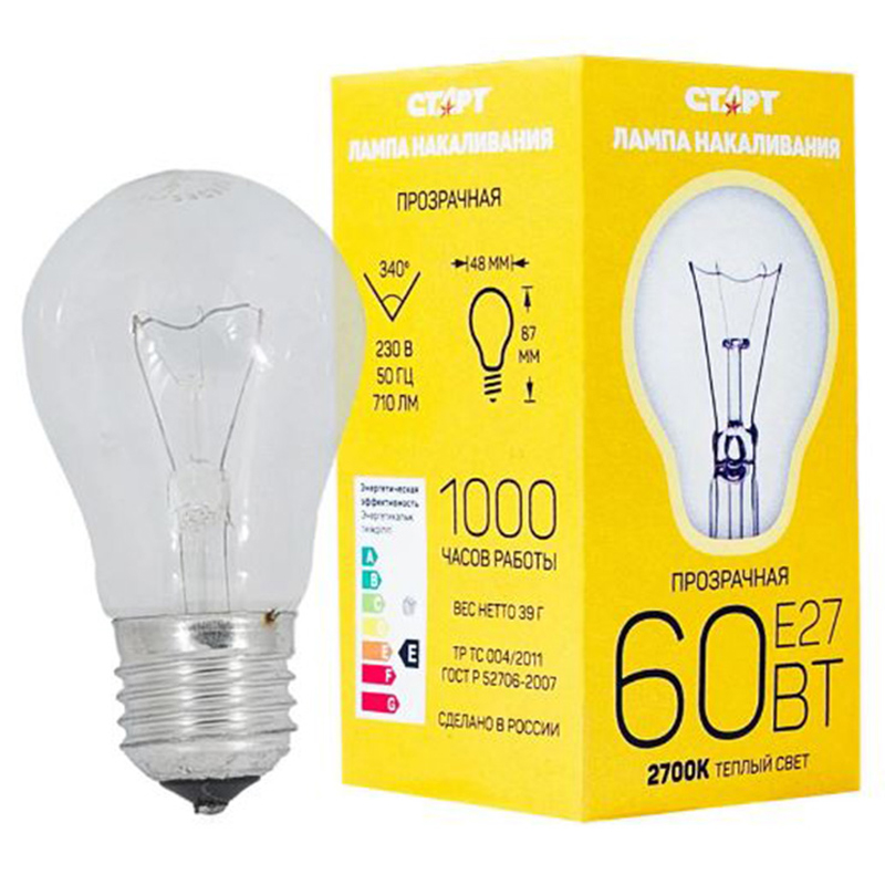 Лампа накаливания СТАРТ Б 60Вт Е27 используется для освещения помещений бытового назначения. Устройство с цоколем Е27 подходит для работы со светильниками люстрами, торшерами и др. Грушевидная прозрачная колба обеспечивает более яркое свечение. Мощность - 60 Вт. Лампа обладает желтой цветностью.