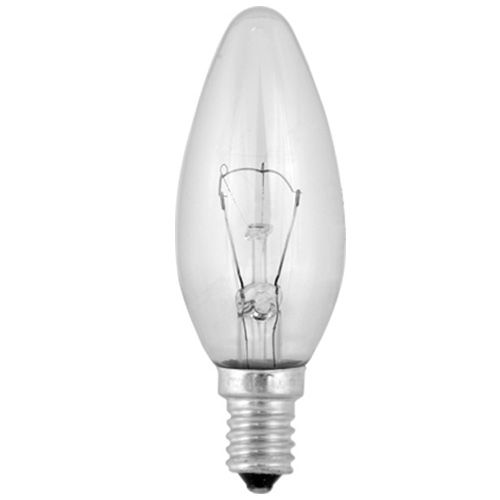 Электрическая лампа накаливания с прозрачной колбой имеет форму свечи и подойдет для всех декоративных светильников, чей цоколь имеет размер Е14.