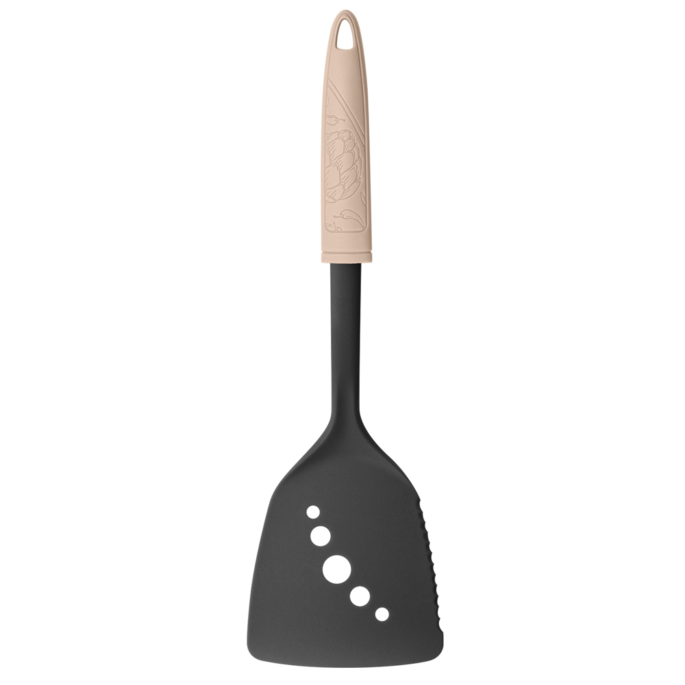 Нейлоновая лопатка имеет удобную вытянутую форму и прорези, позволяющие стечь лишнему маслу и жидкости. Стильная ручка с нескользящим покрытием отлично лежит в руке. Элегантный дизайн прекрасно подойдет к любой кухне.