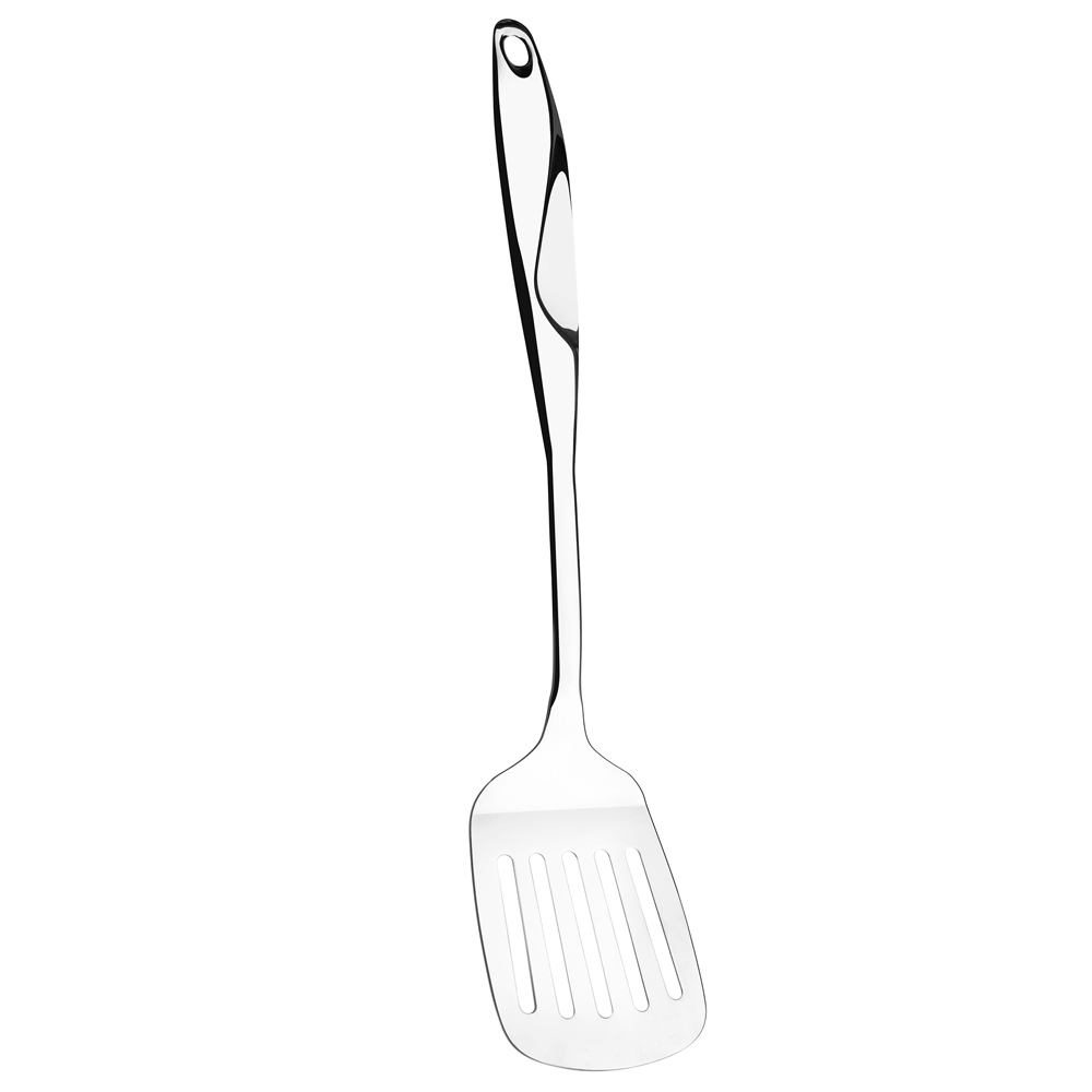 Стальная лопатка с прорезями на длинной ручке. Благодаря прорезям масло или жир стекают, оставляя блюдо максимально вкусным. Ручка не скользит и идеально лежит в руке. Лопатка подходит для мытья в посудомоечной машине.