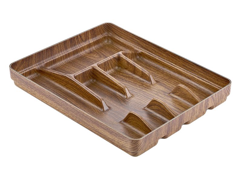 Лоток для столовых приборов на пять отделений изготовлен из ударопрочного полистирола с имитацией дерева.