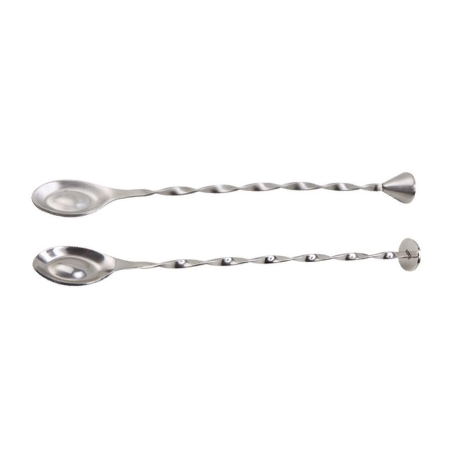 Ложка барная со ступкой нужна для перемешивания ингредиентов в смесительном стакане, но зачастую выполняет несколько дополнительных функций. Внешним видом похожа на обычную чайную ложку, только с длинной ручкой (20-50 см), на обратном конце которой может быть «пестик», заменяющий мадлер, или вилочка для удобной работы с лимоном, цедрой, фруктами и ягодами при украшении коктейля. В одну барную ложку помещается 5 грамм вещества или 5 мл жидкости. Это очень удобно при отмеривании количества сахара, сиропа или меда.