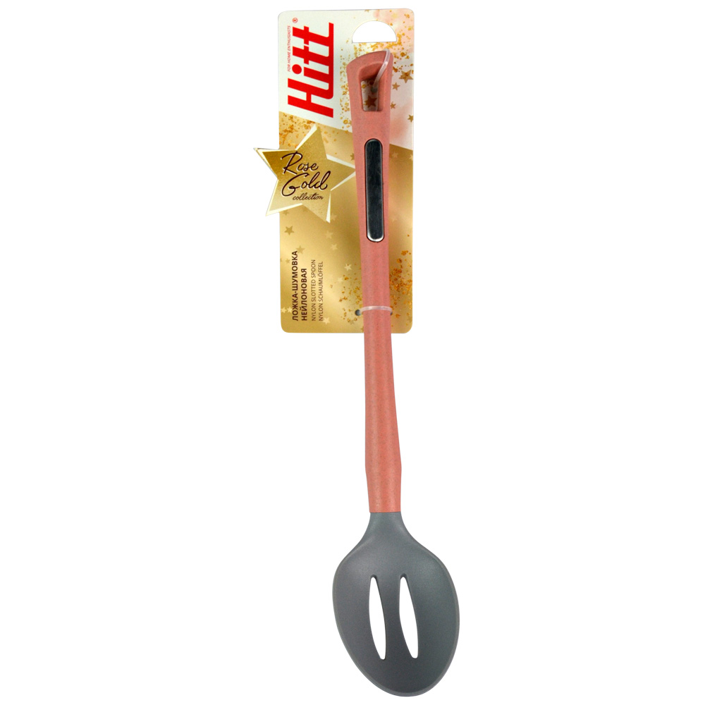 Рабочая часть кухонных аксессуаров Hitt Rose Gold изготовлена из пищевого нейлона. Ложка-шумовка подойдет для посуды с антипригарным и деликатным покрытием. Ручка нежно-розового цвета имеет покрытие soft-touch и отверстие для подвеса.