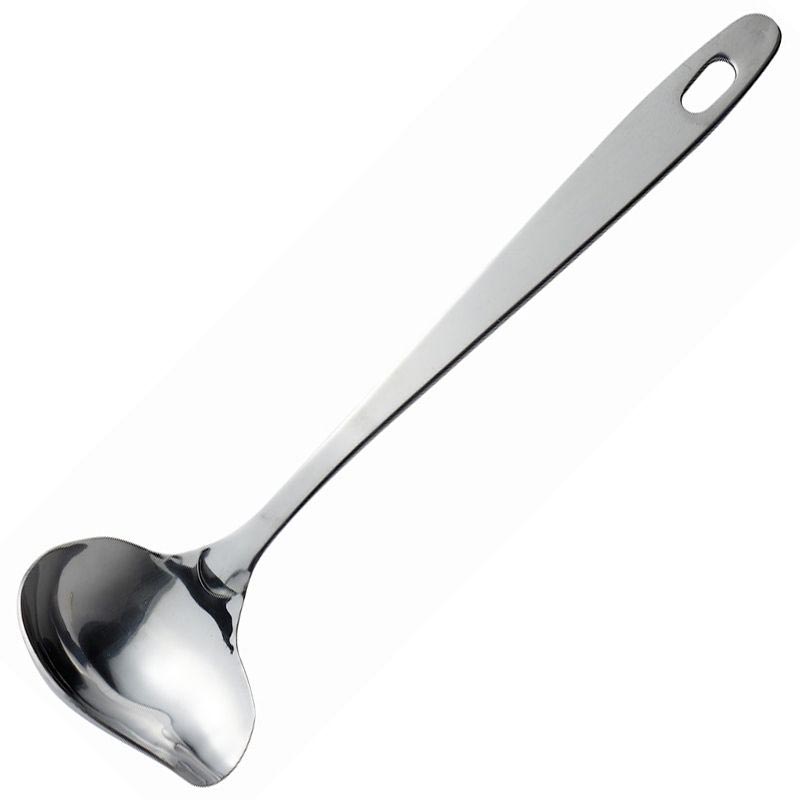 Данная ложка имеет классическую форму с боковым носиком из нержавеющей стали.