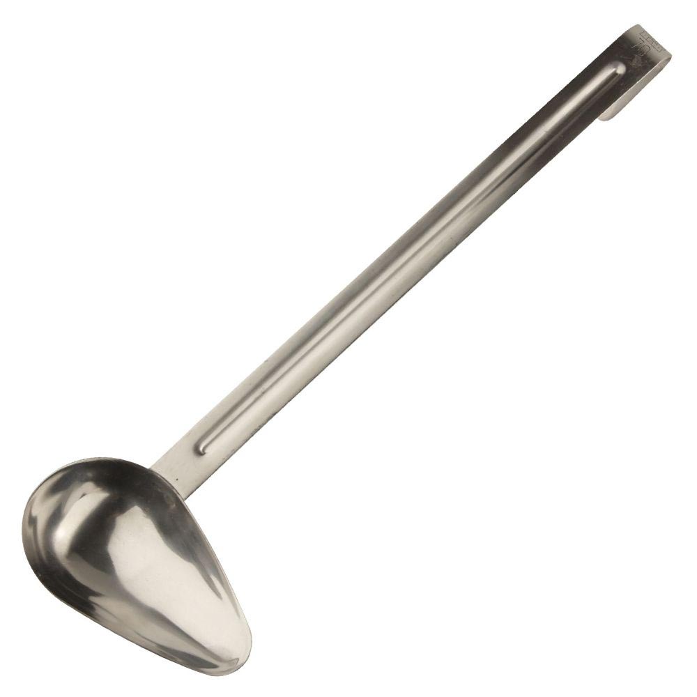 Данная ложка имеет классическую форму с боковым носиком из нержавеющей стали.