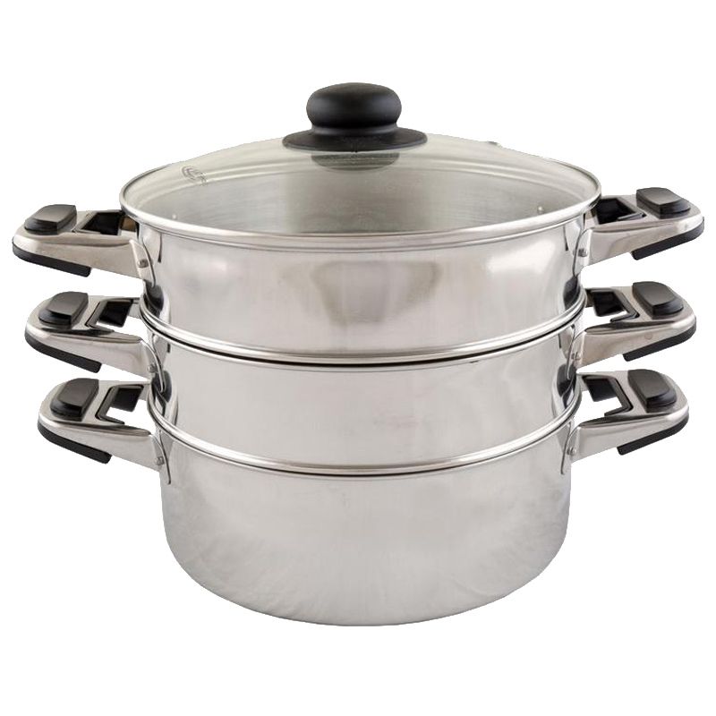 Крышка стеклянная G-типа, с пароотводом, прозрачная. Такая крышка позволяет следить за процессом приготовления пищи без потери тепла, прилегает к краю кастрюль, сохраняя аромат блюд. Бакелитовые ручки не нагреваются. Ручки прикреплены методом клепочной фиксации. Количество секций 3шт, высота секции 5 см наружная полировка - зеркальная. Кастрюля для воды 11см. Диаметр 24 см. Подходит для всех видов плит