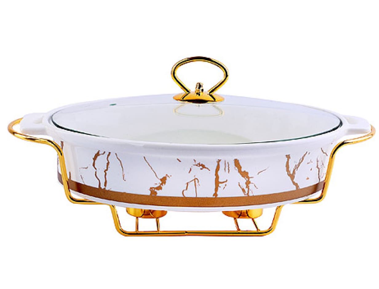 Мармит LORAINE выполнен из фарфора белого цвета, украшенной золотым рисунком. Фарфоровая чаша с удобными ручками располагается на металлической подставке с двумя подсвечниками для чайных свечей (свечи в комплект не входят). Свечи, устанавливающиеся на подставке, нагревает чашу снизу, таким образом поддерживая нужную температуру приготовленного блюда. Стеклянная крышка с удобной ручкой плотно прикрывает чашу сверху, в свою очередь также не давая остыть блюду. Благодаря своему элегантному дизайну, мармит с приготовленным блюдом можно сразу подавать на стол, не перекладывая еду на сервировочные тарелки. Изящный, с современным дизайном, мармит украсит любой праздничный стол, а блюда в нем будут всегда теплыми и ароматными. Фарфоровая чаша (без подставки и крышки) подходит для использования в духовом шкафу. Не подходит для мытья в посудомоечной машине. Подходит для хранения в холодильнике.