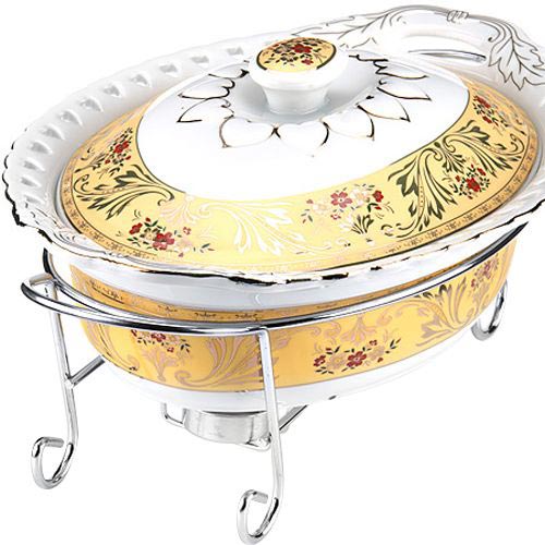 Керамическая чаша с удобными ручками распологается на стальной подставке с двумя подсвечниками.