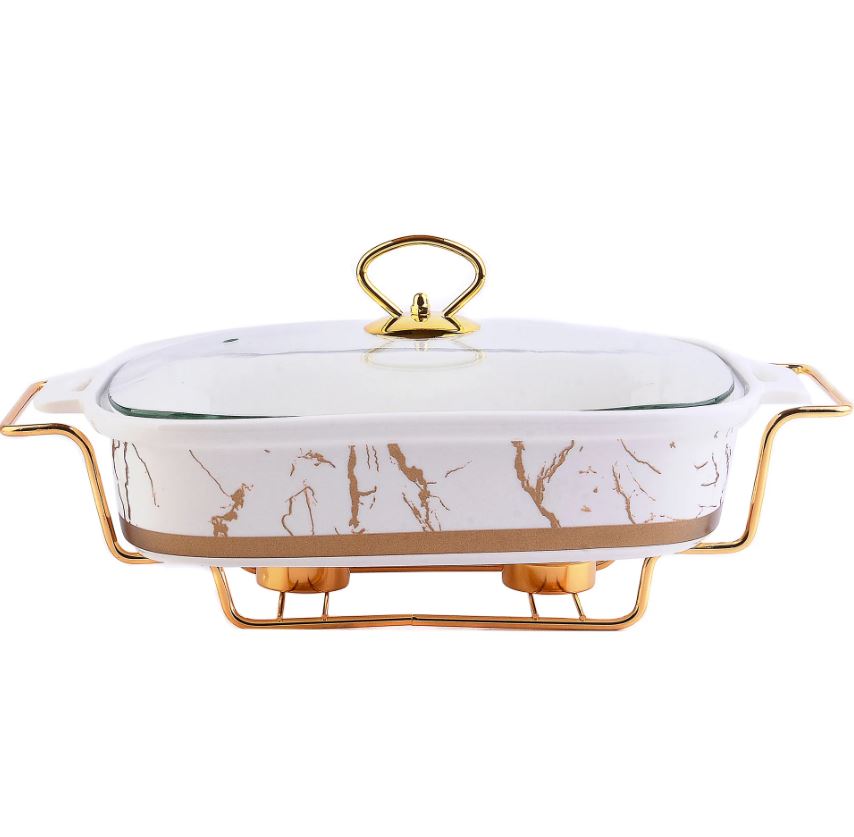 Мармит LORAINE выполнен из фарфора белого цвета, украшенной золотым рисунком. Фарфоровая чаша с удобными ручками располагается на металлической подставке с двумя подсвечниками для чайных свечей (свечи в комплект не входят). Свечи, устанавливающиеся на подставке, нагревают чашу снизу, таким образом поддерживая нужную температуру приготовленного блюда. Стеклянная крышка с удобной ручкой плотно прикрывает чашу сверху, в свою очередь также не давая остыть блюду. Благодаря своему элегантному дизайну, мармит с приготовленным блюдом можно сразу подавать на стол, не перекладывая еду на сервировочные тарелки. Изящный, с современным дизайном, мармит украсит любой праздничный стол, а блюда в нем будут всегда теплыми и ароматными. Фарфоровая чаша (без подставки) подходит для использования в духовом шкафу. Не подходит для мытья в посудомоечной машине. Подходит для хранения в холодильнике.