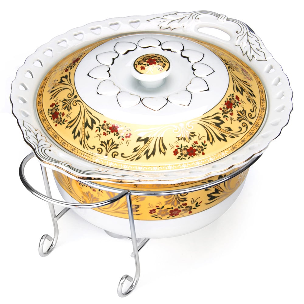 Мармит LORAINE выполнен из керамики белого цвета, украшенной рисунком. Керамическая чаша с удобными ручками располагается на стальной подставке с двумя подсвечниками для чайных свечей (входят в комплект). Свечи, устанавливающиеся на подставке, нагревают чашу снизу, таким образом поддерживая нужную температуру приготовленного блюда. Керамическая крышка с удобной ручкой плотно прикрывает чашу сверху, в свою очередь также не давая остыть блюду. Благодаря своему элегантному дизайну, мармит с приготовленным блюдом можно сразу подавать на стол, не перекладывая еду на сервировочные тарелки. Изящный, с современным дизайном, мармит украсит любой праздничный стол, а блюда в нем будут всегда теплыми и ароматными. Керамическая чаша (без подставки) подходит для использования в духовом шкафу и микроволновой печи. Подходит для мытья в посудомоечной машине. Подходит для хранения в холодильнике.