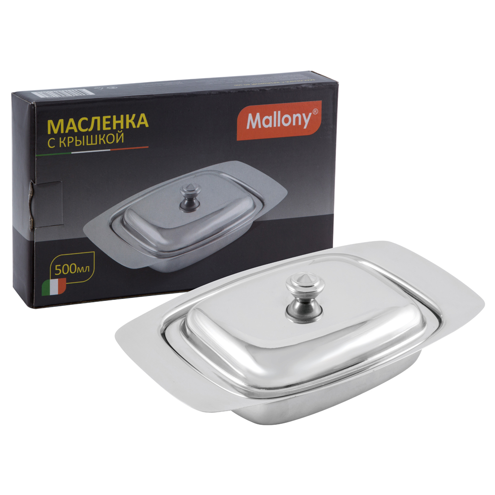 Масленка Mallony BD-500 подойдет для хранения масла и красивой сервировки. Изделие состоит из подноса и крышки из нержавеющей стали . Сливочное масло в ней долго остается свежим, а при хранении в холодильнике не впитывает посторонние запахи.