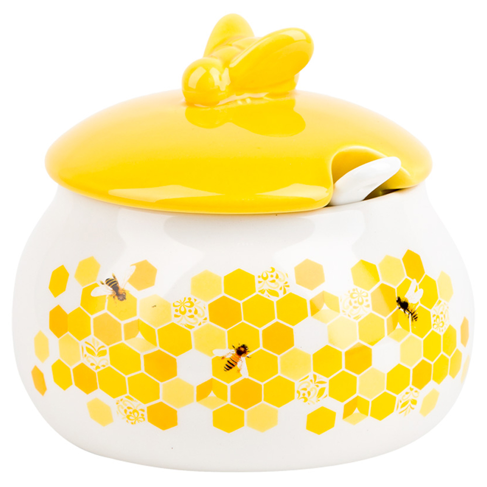 Керамическая медовница из коллекции "Honey". Медовница представлена в виде баночки- бочонка с керамической ложечкой. Держатель крышки выполнен в виде пчелы. Покрыта белой глазурью с изображением сот. Идеально подойдет для подачи меда, варенья. Объем 500 мл.