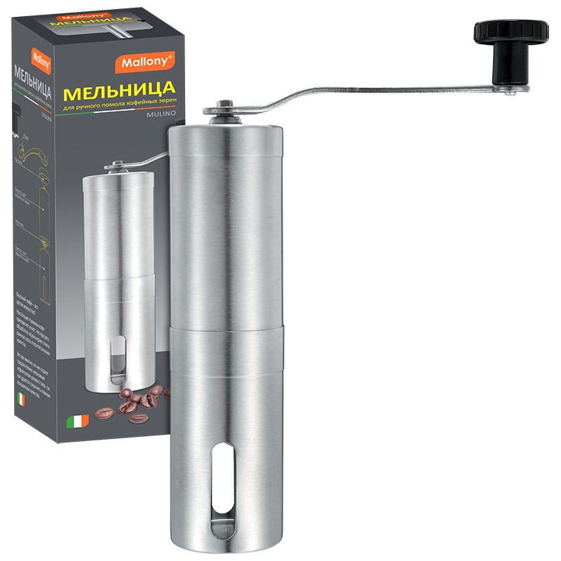 Мельница Mallony Mulino для ручного помола кофейных зерен, со съемной ручкой. Размер: 4,7х19 см, объем 95 мл. Толщина нержавеющей стали - 0,4 мм.