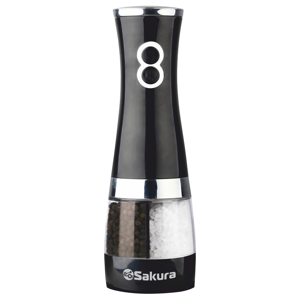 Мельница электрическая для соли и перца от бренда Sakura имеет 2 раздельных контейнера, прочный и договечный керамический механизм, и регулировку степени помола. Работает от 6хАА (1,5В).