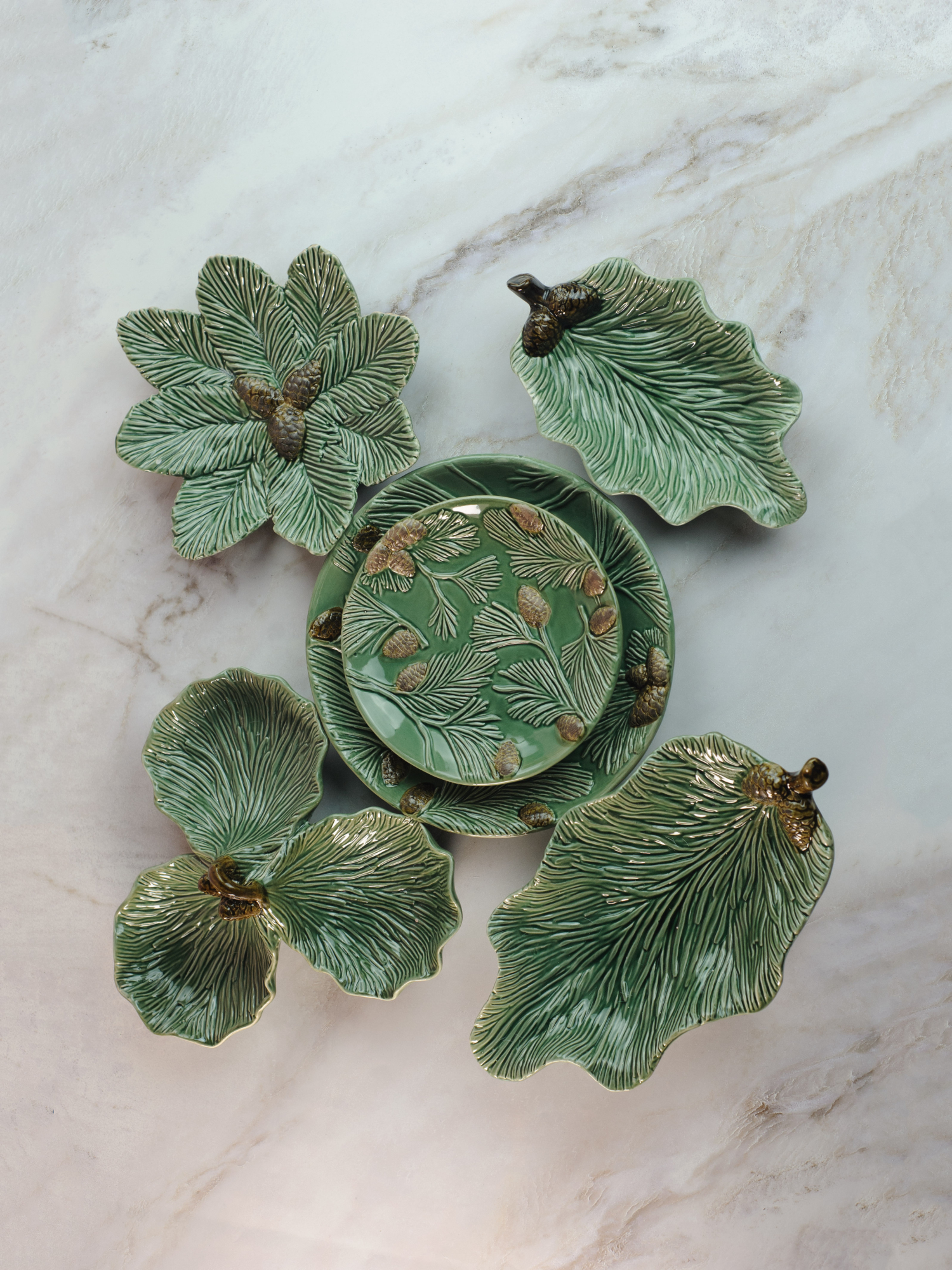 Наша посуда отличается насыщенными зелеными оттенками, которые ассоциируются с зимним лесом и свежестью природы. Объемные шишки и сосновые ветки, изящно оформленные на поверхности изделий, создают поистине волшебную атмосферу, способную перенести вас в сказочный лес. Эти элементы дизайна представлены с особым вниманием к деталям, что подчеркивает уникальность каждого изделия.