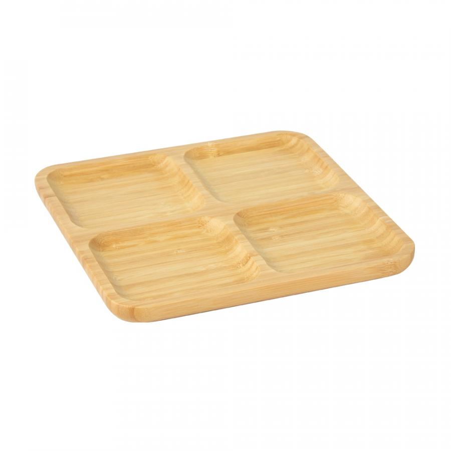 Менажница квадратная на 4 отделения – блюдо позволяющее положить в одну тарелку разную еду не смешивая их между собой. Менажница изготовлена из бамбука. Тарелку можно использовать под различные закуски, фрукты, орехи и соус. Обладает износостойкостью. Тонкая обработка, гладкая поверхность и удобство использования. Менажница не предназначена для мытья в посудомойке. Деревянная менажница из бамбука прекрасный подарок на день рождения, свадьбу, новоселье или новогодние праздники. С обратной стороны можно использовать как деревянную разделочную доску.