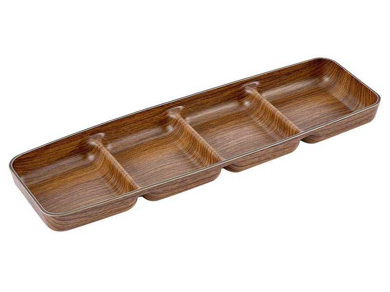 Менажница изготовлена из ударопрочного полистирола с имитацией дерева.