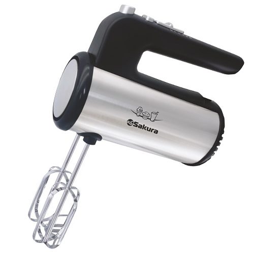 Миксер Sakura SA-6330SBK Premium 500 Вт серебристо-черного цвета с пятью скоростями идет в комплекте с четырьмя насадками. Присутствует турборежим для быстрого перемешивания и взбивания. Устройство оснащено защитой от перегревания. Насадки легко снимаются с помощью кнопки. Размеры модели — 95х160х200. Вес изделия — 1,5 кг.