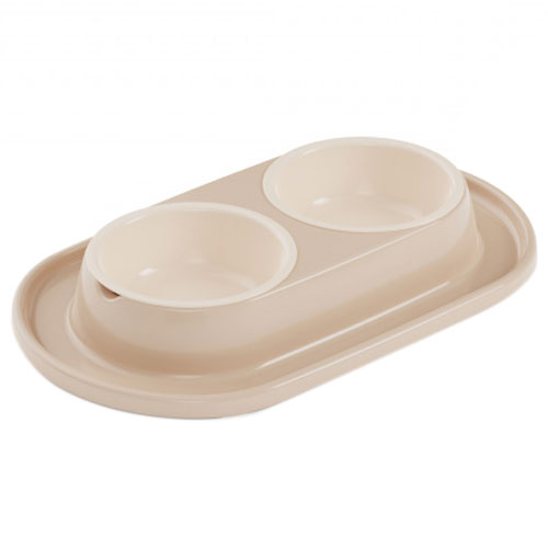 Для удобства в использовании двойная миска на подставке, предназначенная для кормления животных, содержит несколько частей: две съёмные ёмкости и основание с выемками.