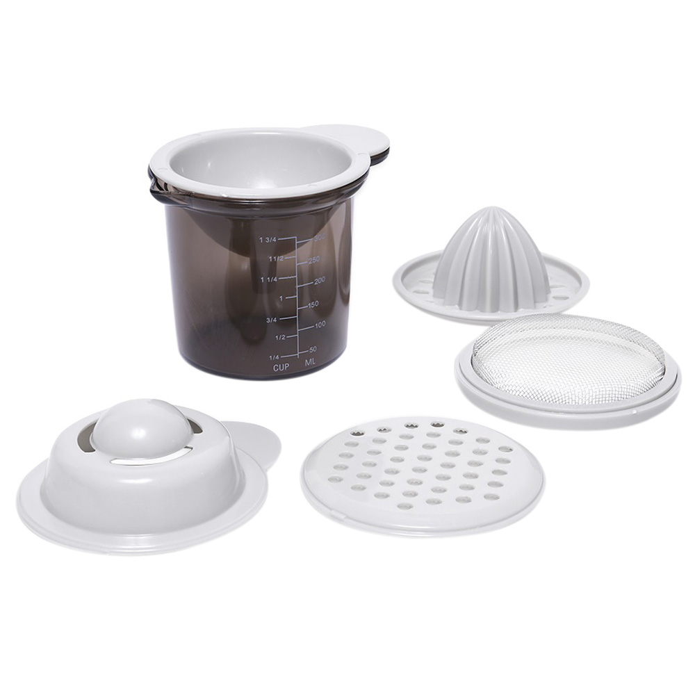 В набор входит: стакан (300 мл) и 5 различных приспособлений (отделитель белка, сито, воронка, соковыжималка, терка для цедры).