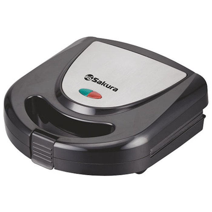 Мультигриль Sakura имеет мощность 750 Вт, корпус изготовлен из черного пластика и нержавеющей стали. Устройство 4 в 1: съемные панели для приготовления сэндвичей, венских вафель, гриля, орешков.