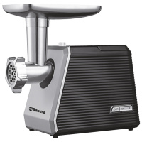 Мясорубка электрическая Sakura SA-6424BK мощностью 2000 Вт, функция реверс, корпус из эко-пластика черного цвета, вместительный металлический лоток для продуктов, металлический шнек, пластиковый толкатель, нож из нержавеющей стали, 2 металлических диска для измельчения (5 мм, 7 мм), насадка для кеббе и для приготовления сосисок. Есть отсек для хранения насадок, функция отключения при перегреве.