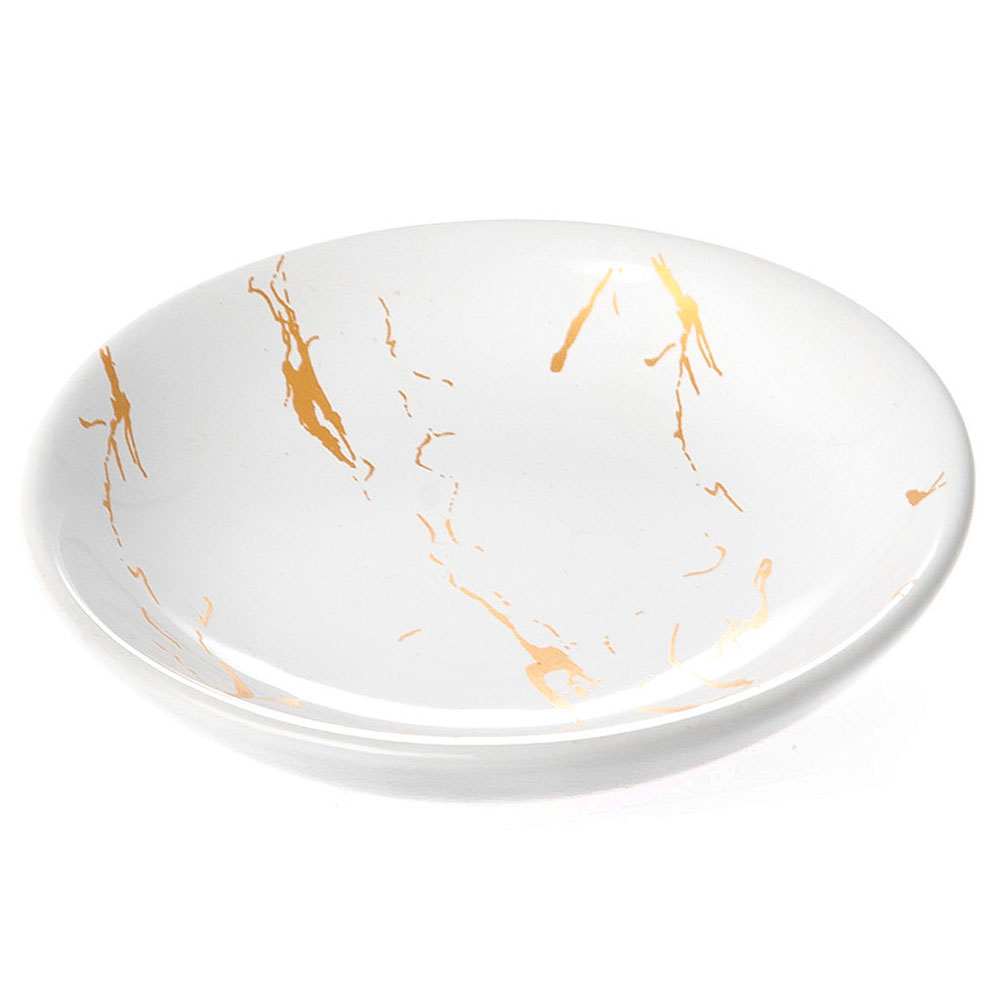В коллекции "Мрамор" также представлена мыльница и диспенсер из керамики. В дополнение к к керамическим аксессуарам можно подобрать коврики и штору для ванной с аналогичным принтом.