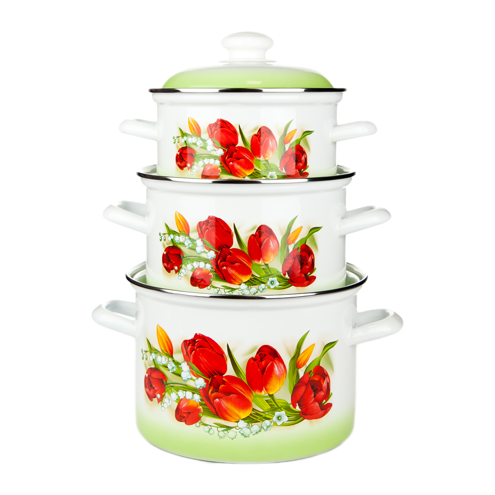 Набор эмалированной посуды "Ласковый май" состоит из трех кастрюль разного объема с крышками. Посуда выполнена из тонколистового стального проката, покрытого двумя слоями эмали. Корпус кастрюль оформлен изображением красочных цветов.