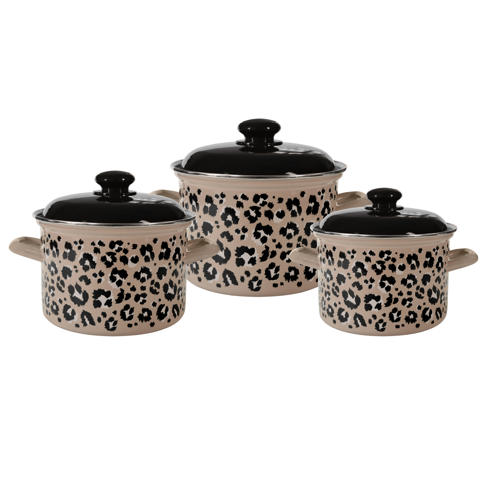 Набор эмалированных кастрюль выполнен из тонколистового стального проката, покрытого двумя слоями эмали белого цвета. Корпус кастрюль оформлен изображением цветов.