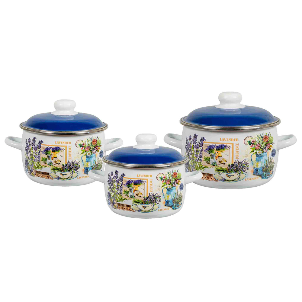 Набор эмалированных кастрюль производства "СтальЭмаль" с рисунком "Лаванда".