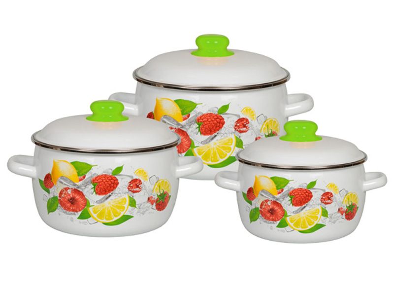 Набор эмалированных кастрюль производства "СтальЭмаль" с рисунком "Лимон" (арт.1KA021M). Крышки оснащены эргономичными пластиковыми ручками - удобно браться, не боясь обжечься.