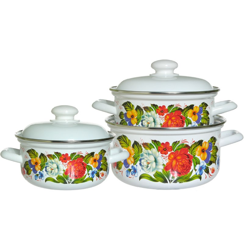 Кастрюли изготовлены из стали и покрыты эмалью, наружные стенки декорированы цветочным рисунком. Эмалевое покрытие имеет существенные преимущества по показателям безопасности влияния на организм человека, санитарным свойствам, простоте ухода и рассчитан на длительный срок эксплуатации. Оно устойчиво к перепадам температуры до 220°С, обладает высокой механической прочностью, противостоит воздействию пищевых кислот.