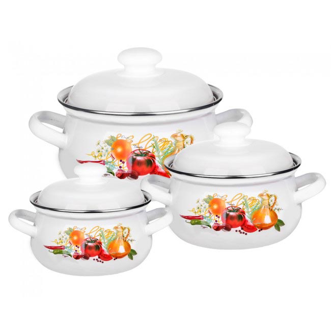 Набор эмалированной посуды "Итальянская кухня" состоит из трех кастрюль разного объема с крышками.