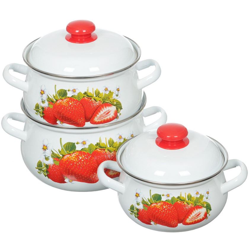 Набор эмалированной посуды "Сочная клубника" состоит из трех кастрюль разного объема с крышками.