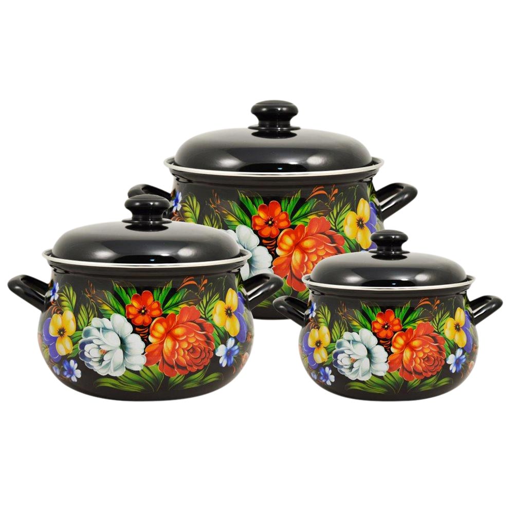 Набор эмалированной посуды "Анютины глазки" состоит из трех кастрюль разного объема с крышками. Посуда выполнена из тонколистового стального проката, покрытого двумя слоями эмали кремового цвета. Корпус кастрюль оформлен изображением старинных домов.Эмалевое покрытие имеет существенные преимущества по показателям безопасности влияния на организм человека, санитарным свойствам, простоте ухода и рассчитан на длительный срок эксплуатации. Оно устойчиво к перепадам температуры до 220°С, обладает высокой механической прочностью, противостоит воздействию пищевых кислот.Борта корпуса и крышки изделий защищены ободком из коррозионностойкой стали. Арматура на крышке изделий пластиковая, на корпусе полая.Эмалированную посуду нельзя ронять, нагревать без жидкости, допускать замерзания в ней жидкости, чистить металлической мочалкой.