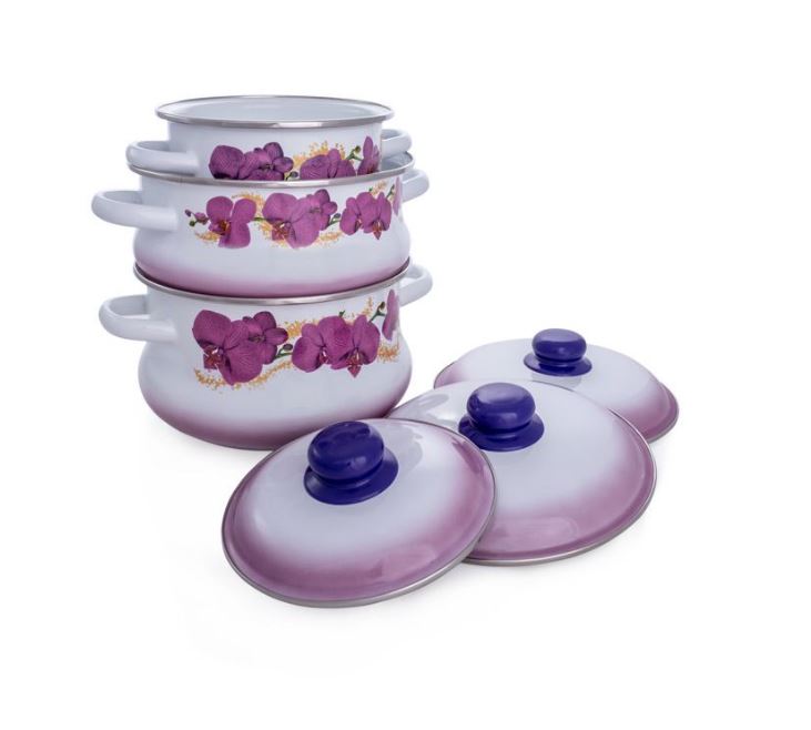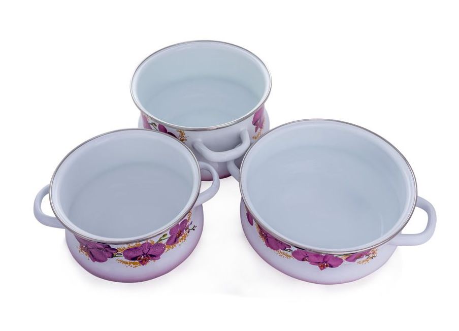 Набор эмалированных кастрюль "Орхидея" состоит из 3 кастрюль разного объема.